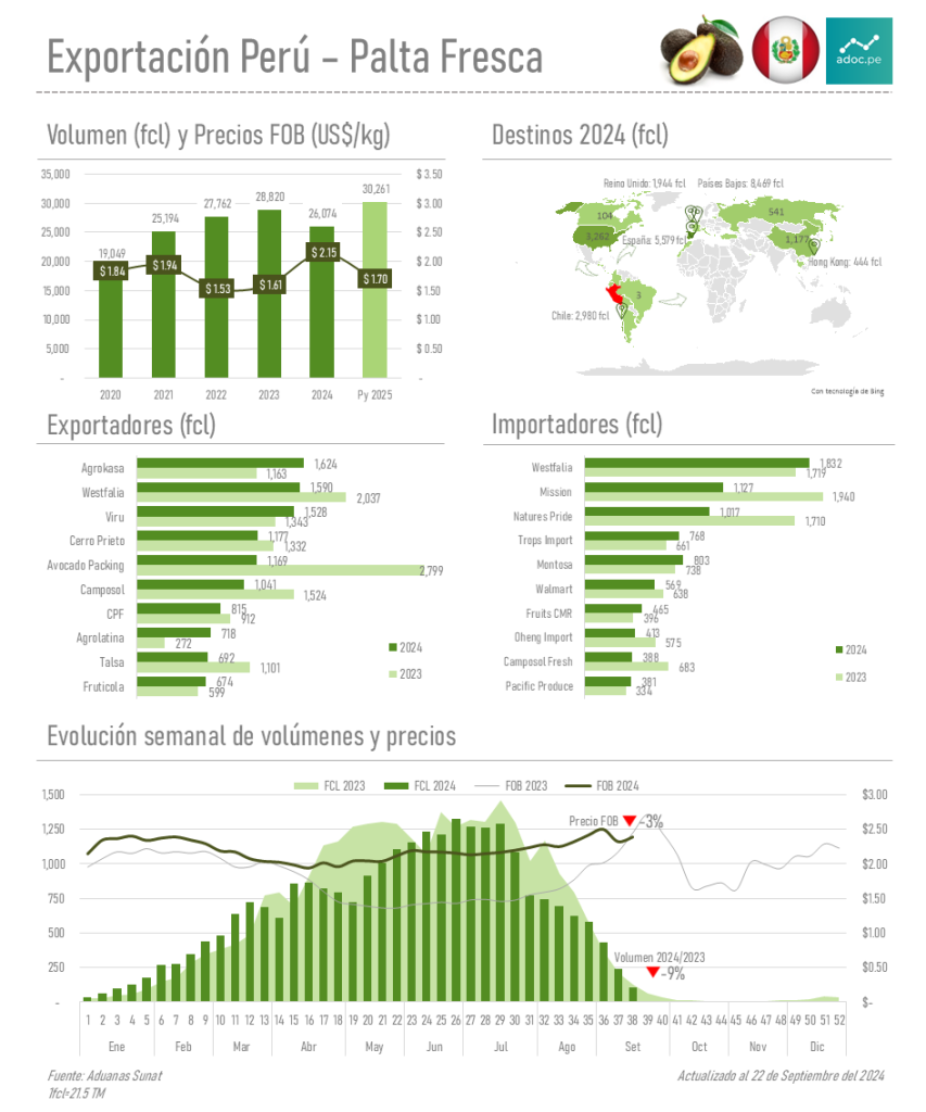 Durante la mayor parte de la campaña la empresa Westfalia lideró el volumen de exportación de palta fresca, luego a partir de la semana 26 la empresa Agrokasa y Viru incrementan sus volúmenes de exportación, quedando Agrokasa como líder exportador a partir de la semana 36 hasta la 38 acumulando un volumen de 1,624 contenedores.