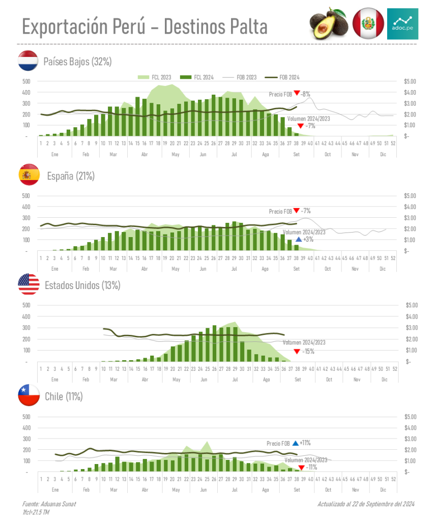 El reporte de la exportación de Palta al cierre de la semana 38 indica un volumen menor en 9% con respecto a la campaña 2023, cerrando con un volumen total de 26,074 contenedores.