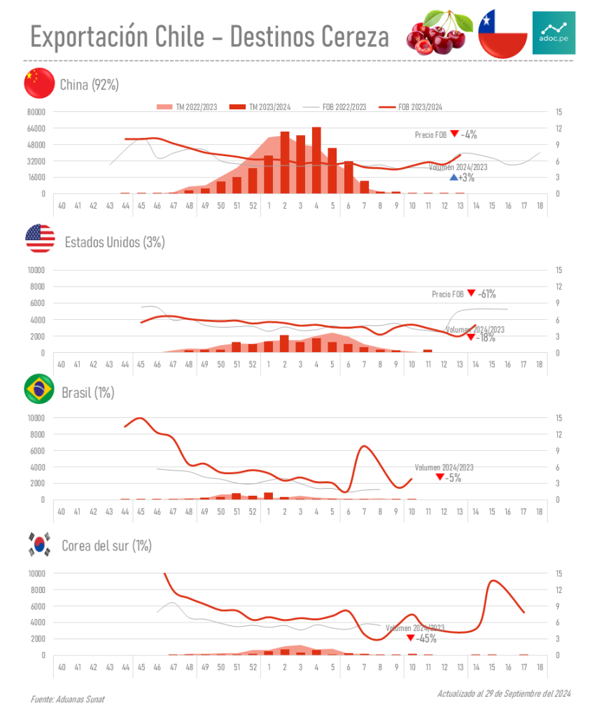 El comportamiento semanal de las exportaciones de cerezas muestra una fuerte estacionalidad, con picos en las exportaciones concentradas en las semanas correspondientes a diciembre y enero, coincidiendo con la temporada navideña y de fin de año en muchos mercados internacionales, especialmente en Asia. Las cerezas frescas son particularmente demandadas durante este período debido a su naturaleza perecedera y su popularidad como regalo o producto de lujo en eventos festivos en países como China.