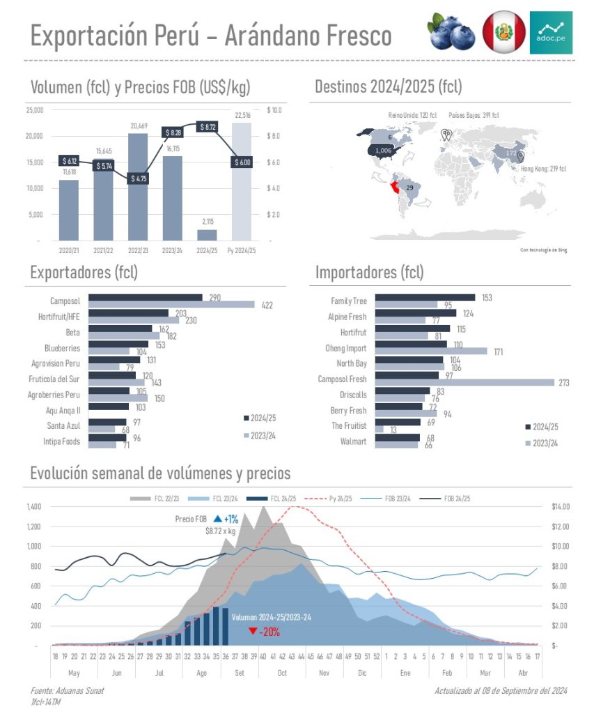 ✅ La exportación del arándano fresco desde Perú al cierre de la semana 36 (08 de septiembre) con las principales variables como volúmenes, precios, exportadores, importadores, curvas semanales y los principales destinos con volúmenes y precios en la segunda imagen