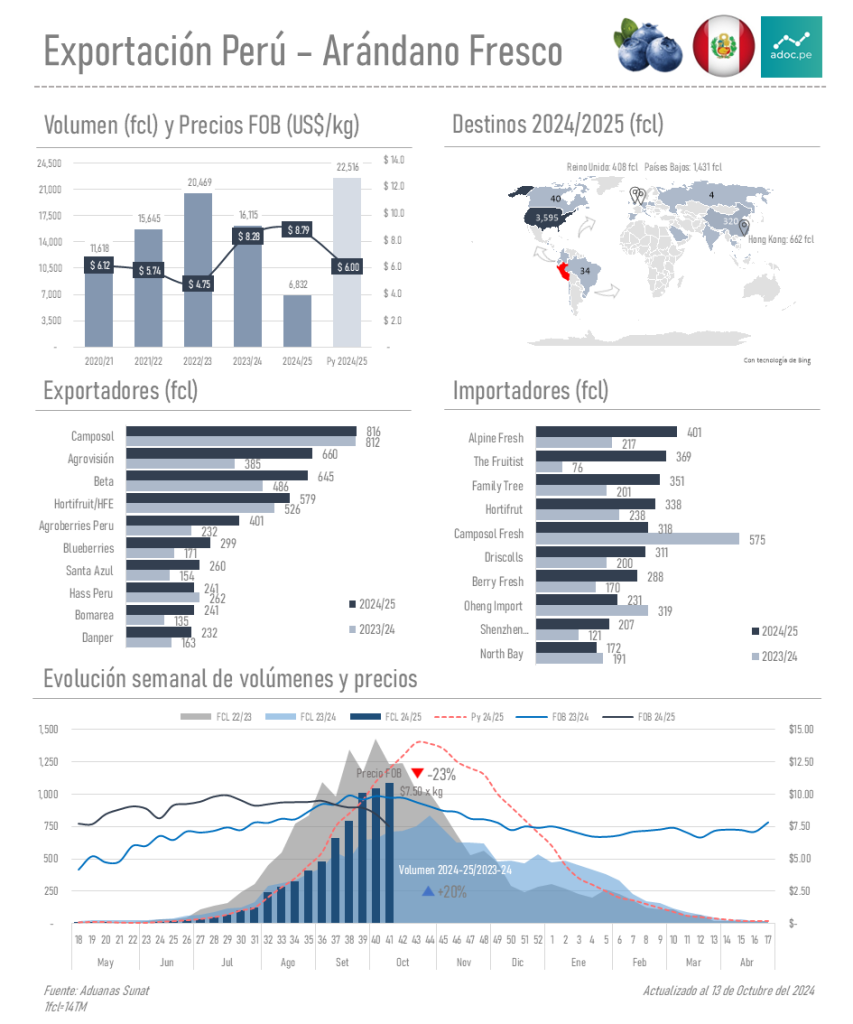 Nuestro reporte de exportación de arándanos actualizado al cierre de la semana 41 (13 de octubre) tiene un volumen total de 6,832 contenedores lo muestra un 20% más que la temporada pasada en el mismo periodo. La industria del arándano en Perú continúa posicionándose como un actor relevante en el mercado global, logrando recuperar sus volúmenes anteriores a la campaña anterior afectados duramente por el fenómeno El Niño.