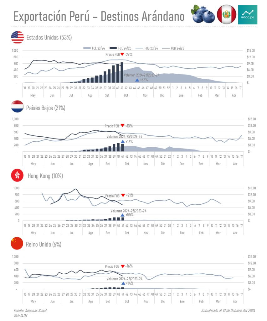 Los principales mercados para los arándanos frescos peruanos son Estados Unidos, Países Bajos y Hong Kong, con los estados Unidos liderando la demanda con 3,595 contenedores. Estos mercados reflejan el creciente interés en productos frescos y saludables provenientes del Perú.