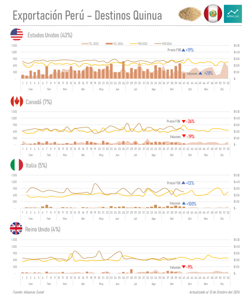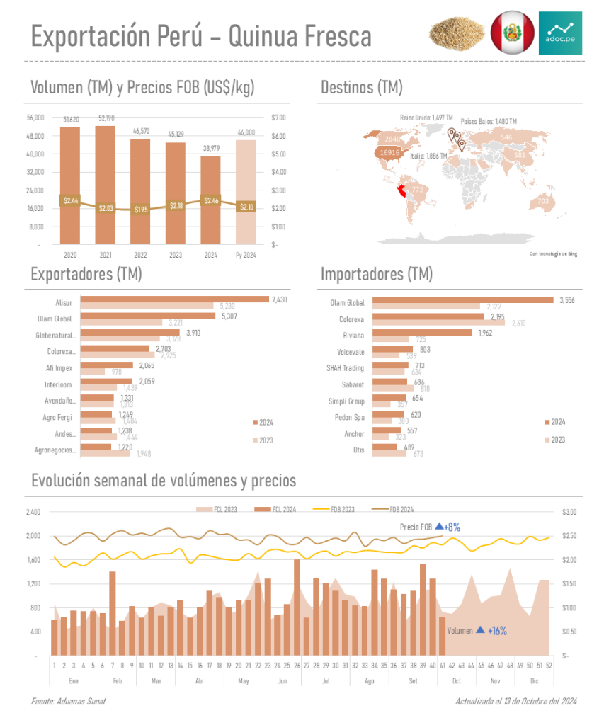 En la exportación de la quinua fresca peruana al cierre de la semana 41 (13 de octubre del 2024) se tiene un volumen de 38,979 toneladas, lo que equivale un aumento comparado con el año 2023 en el que hubo 33,717 toneladas en el mismo periodo.
