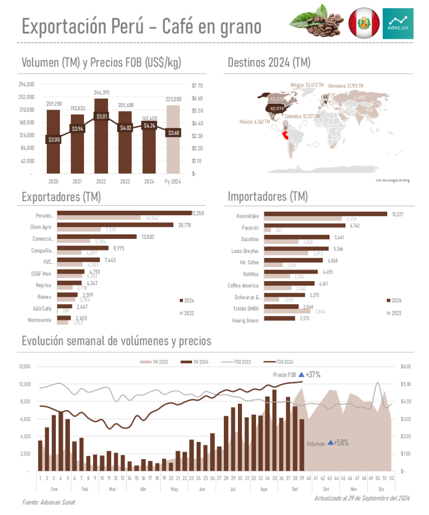 El análisis de las exportaciones de café en grano de Perú para 2024 muestra una recuperación sólida tanto en volumen como en precios. El aumento del 58% en los volúmenes exportados refleja una mayor demanda internacional y una mejora en la capacidad productiva del sector cafetalero peruano. Los principales destinos de exportación, como Estados Unidos, Alemania, Bélgica y Canadá, confirman la relevancia de Perú como un proveedor estratégico de café.