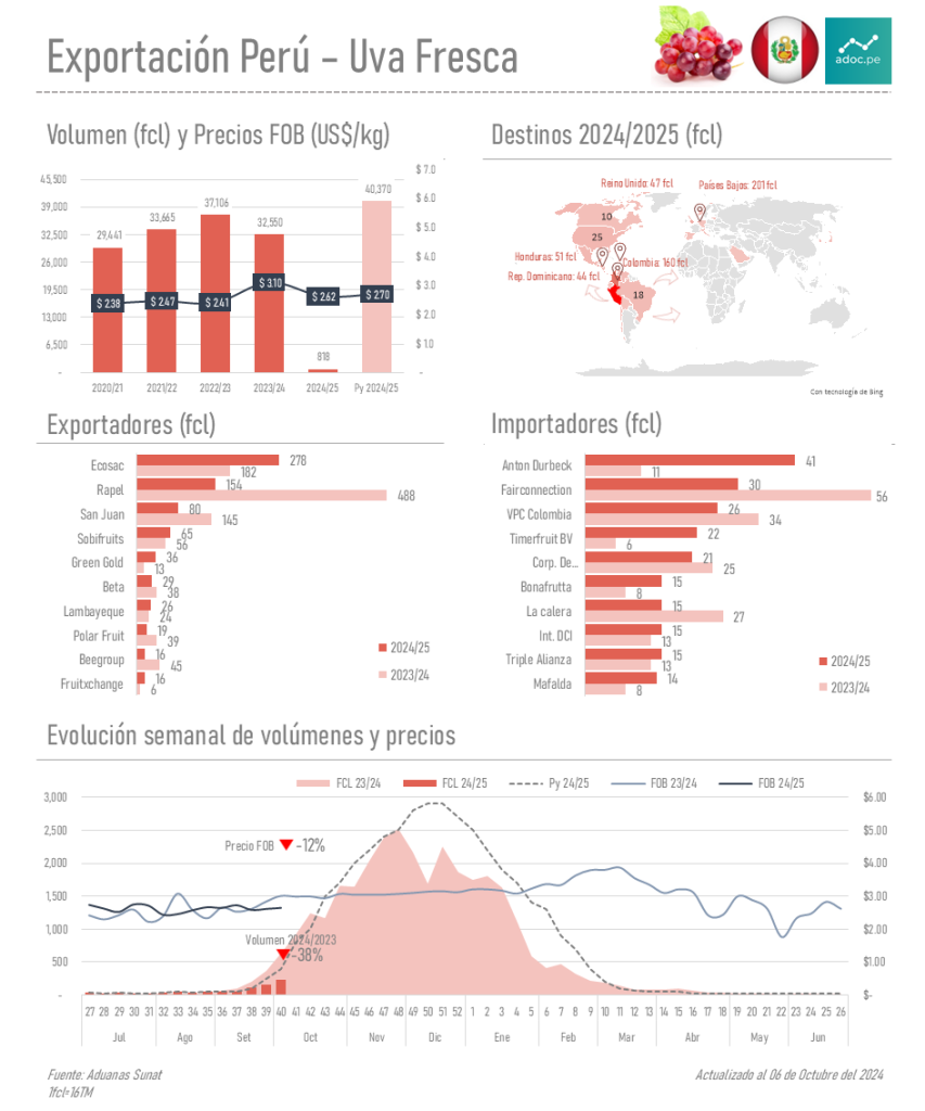 En el panorama de los importadores, Anton Durbeck y Fairconnection encabezan la lista, consolidando su posición como socios comerciales clave para las uvas frescas peruanas.