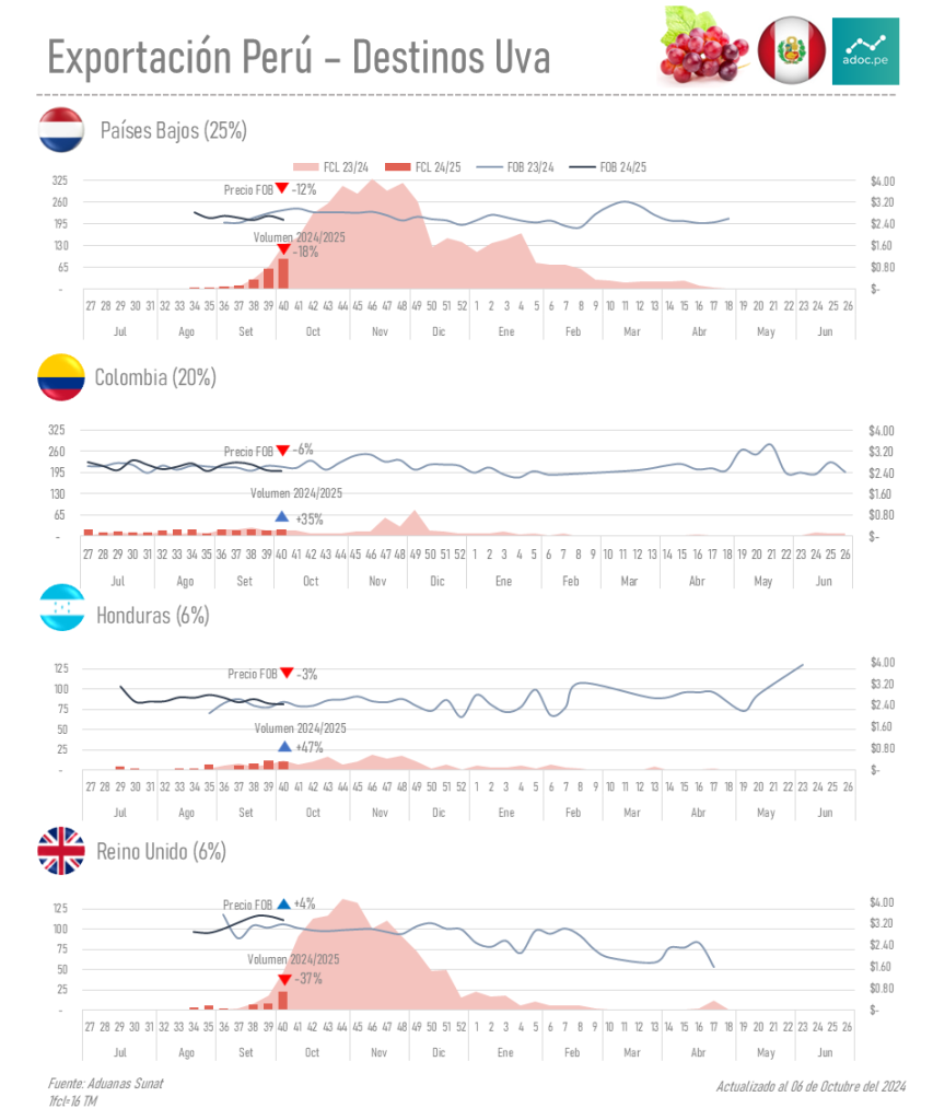El gráfico de evolución semanal revela una dinámica interesante: aunque se ha registrado una caída del 38% en el volumen exportado en comparación con la temporada 2023/2024, existe que se dará una clara recuperación en los últimos meses del año. Este patrón estacional es característico del mercado de la uva fresca, donde los picos de exportación coinciden con la demanda internacional durante los meses de noviembre a febrero.