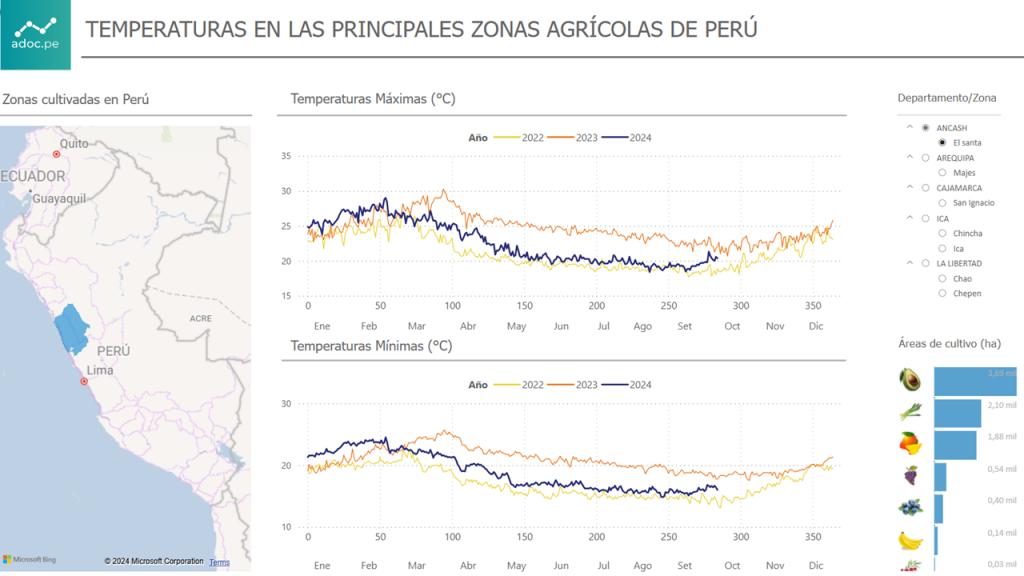 Les presentamos el reporte dinámico de temperaturas máximas y mínimas con información de las principales zonas agrarias del Perú a lo largo del año desde el año 2022, 2023 y 2024, actualizado hasta el 11 de Octubre del 2024.